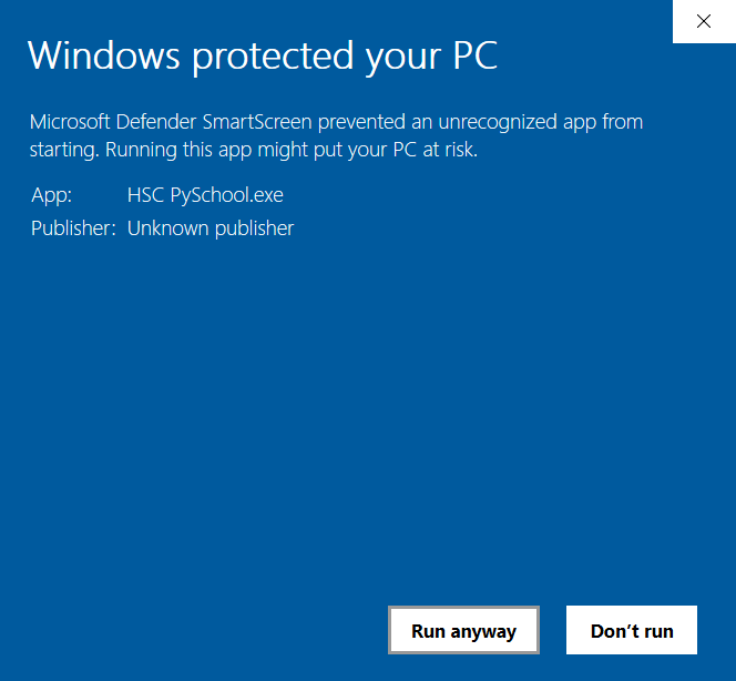 4. Open the extracted folder and double click HSC PySchool.exe. Depending on your security settings, this may or may not bring up a security window as shown below.